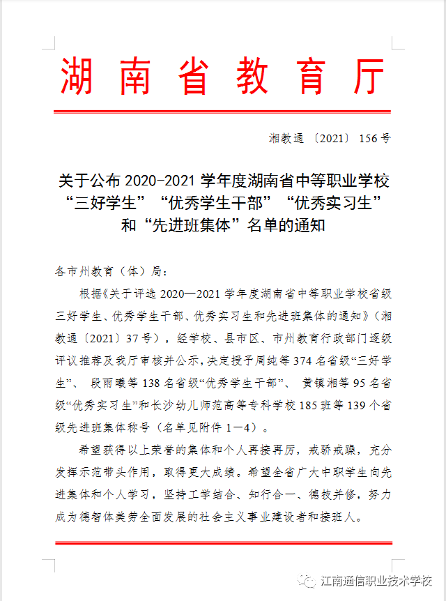 經(jīng)學(xué)校評(píng)議、推薦,岳陽(yáng)市教育局、湖南省教育廳審核評(píng)定2020-2021學(xué)年度湖南省中等職業(yè)學(xué)?!笆〖?jí)三好學(xué)生、優(yōu)秀學(xué)生干部、優(yōu)秀實(shí)習(xí)生、先進(jìn)班級(jí)體”評(píng)選結(jié)果新鮮出爐!