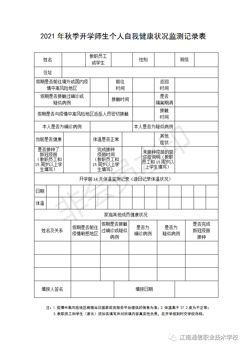 開(kāi)學(xué)時(shí)請(qǐng)攜帶紙質(zhì)2021年秋季開(kāi)學(xué)師生個(gè)人自我健康狀況監(jiān)測(cè)記錄表格上交學(xué)校。