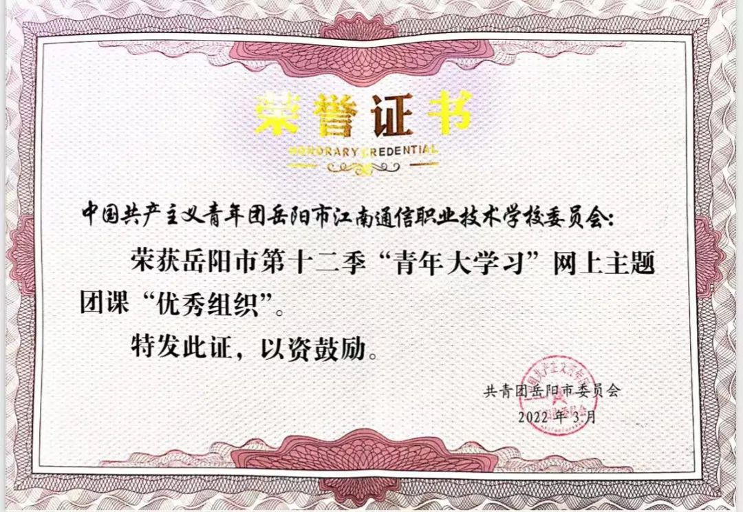 近日,從共青團(tuán)岳陽(yáng)市委員會(huì)傳來(lái)消息,我校榮獲岳陽(yáng)市第十二季“青年大學(xué)習(xí)”網(wǎng)上主題團(tuán)課“優(yōu)秀組織獎(jiǎng)”。